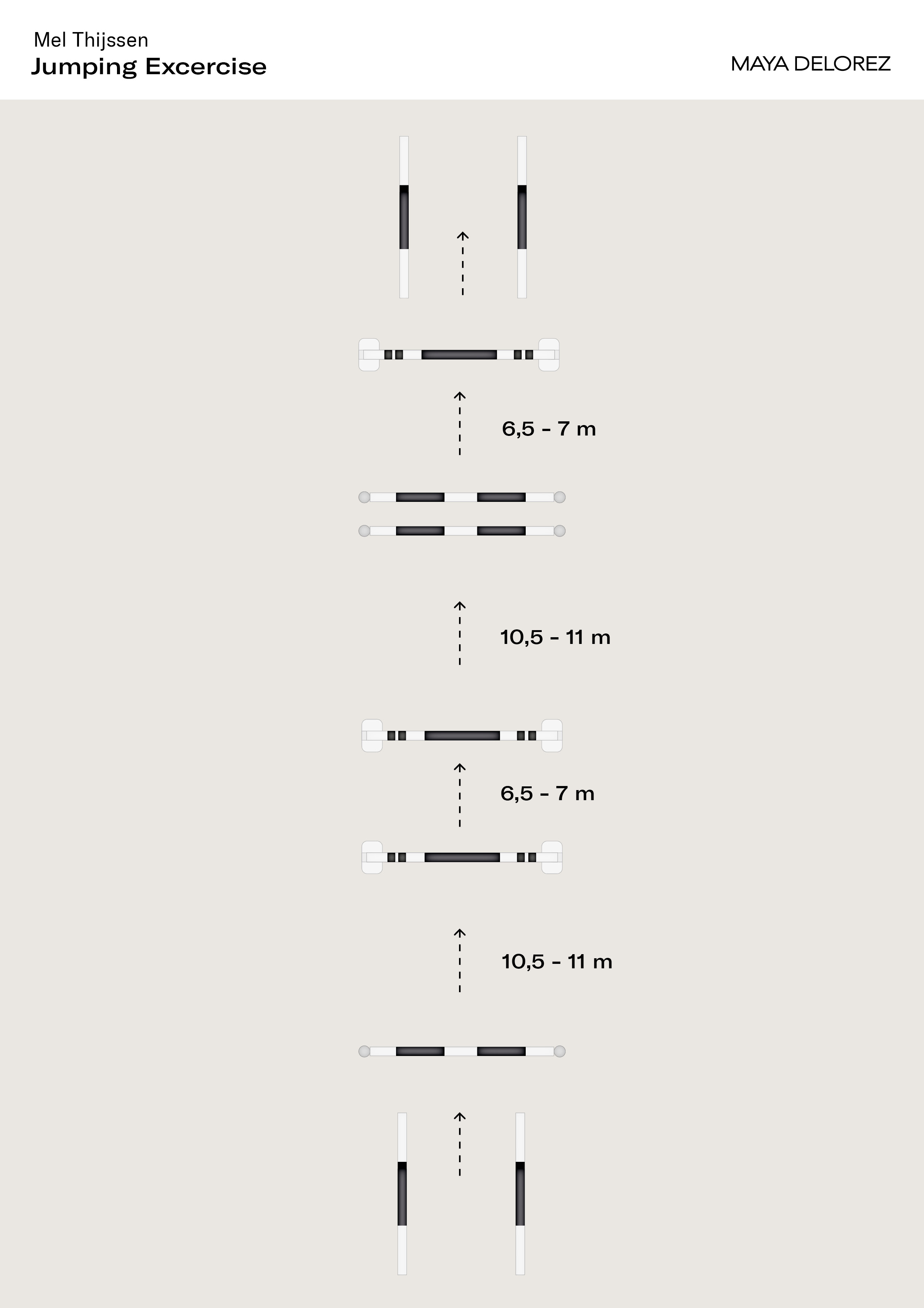 “Zet eerst een serie hindernissen neer: een steilsprong, twee cavaletti, een oxer en nog een cavaletti. De afstand tussen de steilsprong en de set cavaletti moet ongeveer 10,5 tot 11 meter zijn, met 6,5-7 meter tussen de twee cavaletti. De afstand tussen de cavaletti en de oxer is ook 10,5-11 meter, en dan nog eens 6,5-7 meter tussen de oxer en de laatste cavaletti.